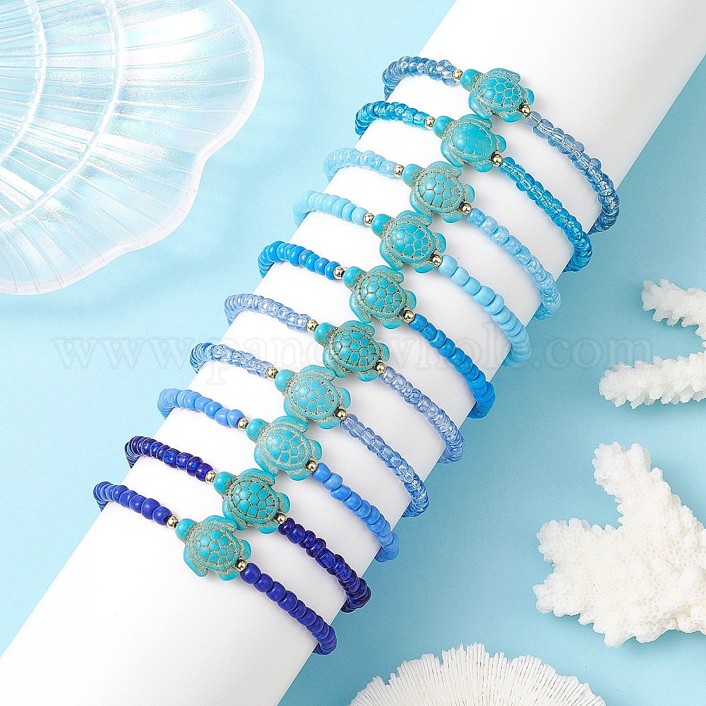 10шт. 10 цвета, браслеты из стеклянного бисера и синтетического бирюзового бисера, эластичные, для женщин, черепаха, с латунным