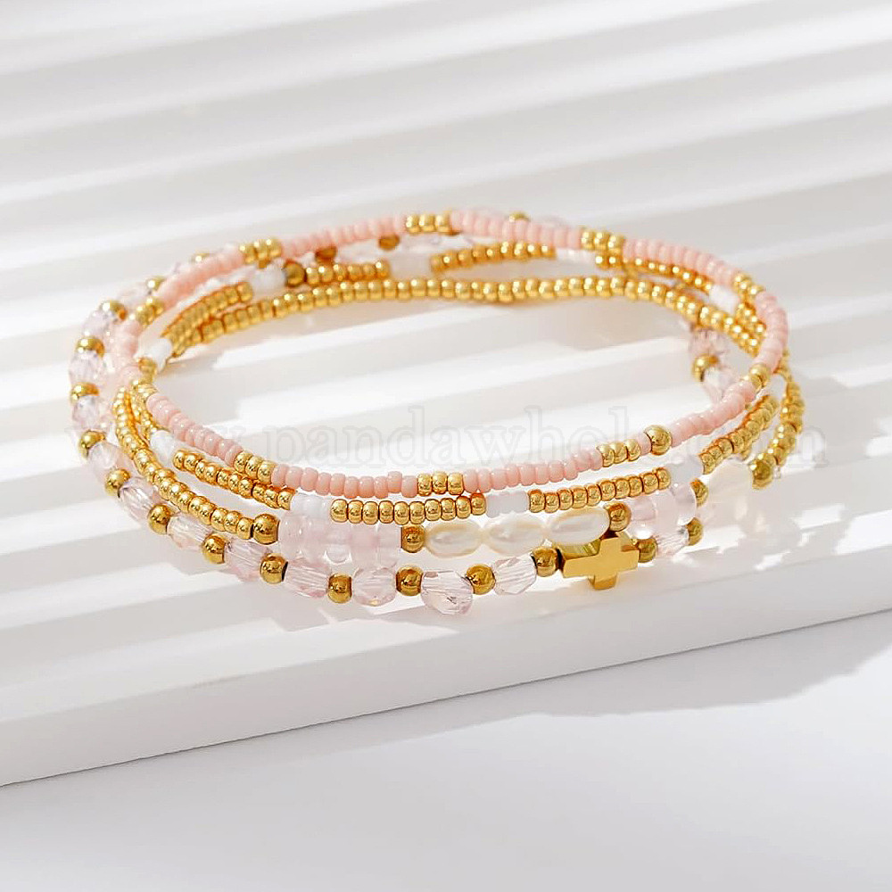 4шт. 4 виды браслетов из латуни, стекла, бисера и искусственного жемчуга, эластичные, Набор браслетов для женщин, которые можно носить в несколько рядов., круглый и крест, золотые (03BS1F)