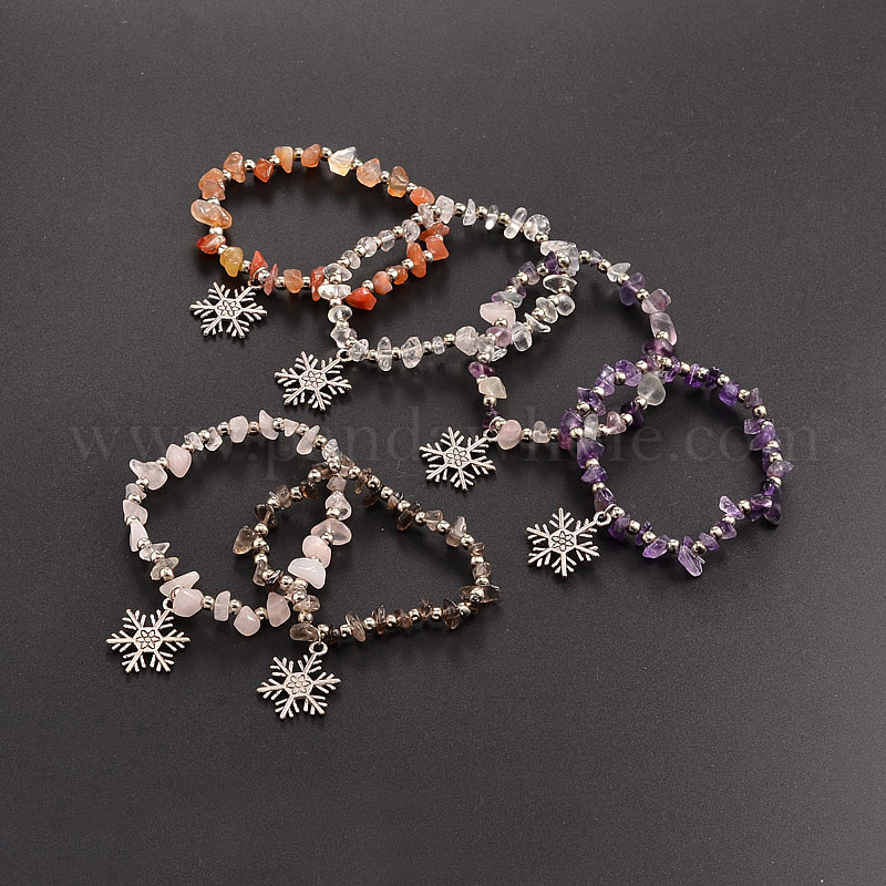 Природных драгоценных камней из бисера стрейч дети шарм браслеты, с железными бисером и тибетский стиль снежинка подвески, 45 мм
