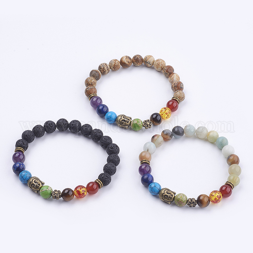 Чакра ювелирные изделия, природных драгоценных камней браслеты простирания, с бусинами сплава, сумки мешковины, античная бронза, Будда и цветок