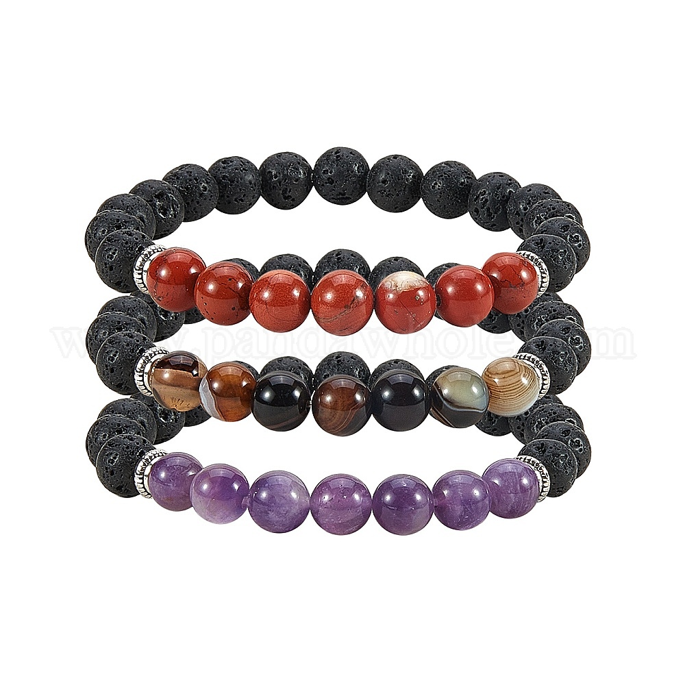 3 шт 3 цвета окрашенные натуральные агатовые бусины эластичные браслеты, с бусинами из синтетической лавы, бусины из сплава и бархатная сумка, круглые