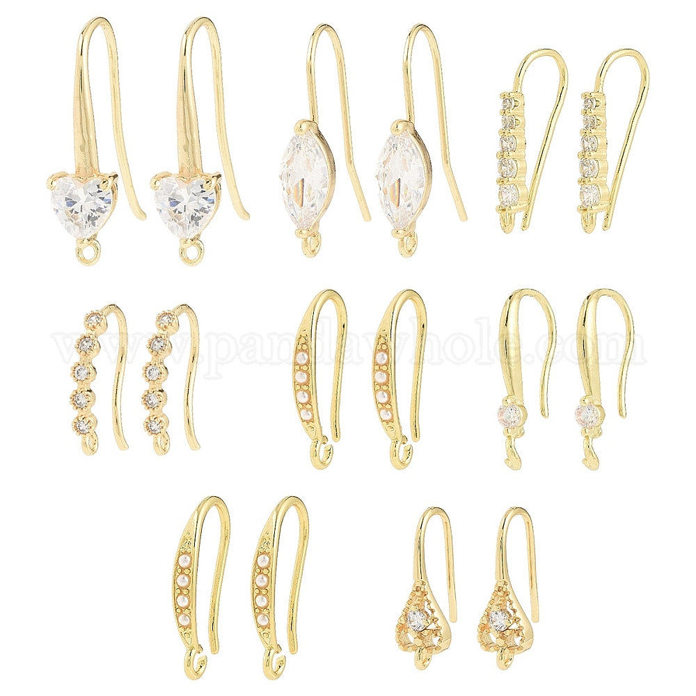 • Настоящее золото 18K 16шт 8 стили латунные крючки для сережек, с кубическим цирконием и горизонтальной петлей, без никеля , реальный 18 k позолоченный, 15~29x9~17x2~5 мм, отверстие : 1~1.8 мм, штифты : 0.7~1 мм, 2 шт / стиль