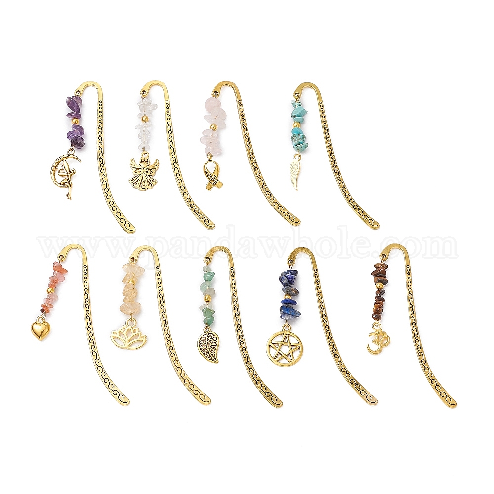 • Смешанные камни 9 шт. натуральные смешанные бусины из драгоценных камней и закладка из сплава, закладка крючком из сплава, разнообразные, 84x14x2 мм