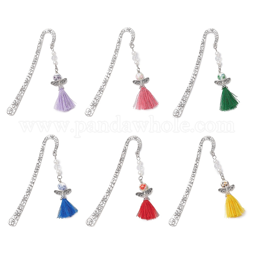 Закладки с крючками из сплава, закладки для книг с подвесками из фарфоровых бусин и поликоттона с кисточками (031M9B)