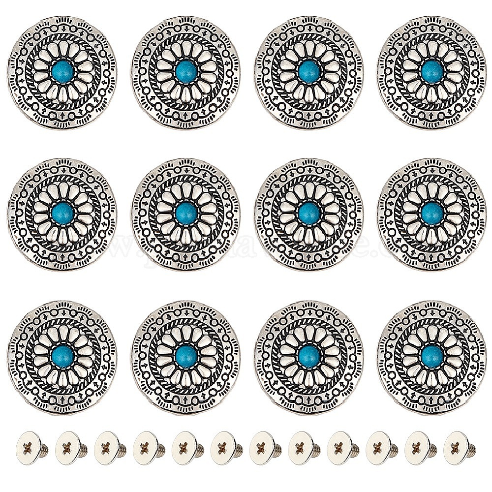 • Бирюза 12 наборы заклепок из сплава и имитации бирюзы, с железной фурнитурой, плоские круглые с цветочным узором, для поделок багажа и аппаратных принадлежностей, бирюзовые, 30x8.5 мм, отверстие : 2.5 мм