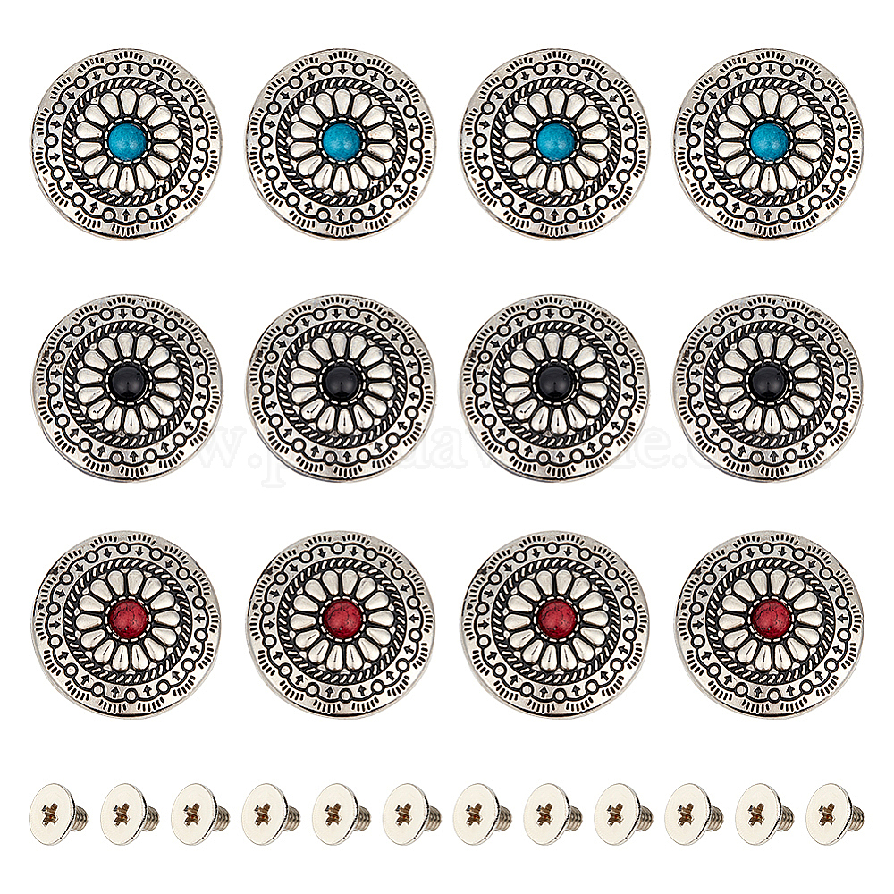 12 наборы 3 цвета сплав и имитация бирюзы ремесло цельный винт заклепка, с железными винтами, плоские круглые с цветочным узором, для поделок багажа и аппаратных принадлежностей