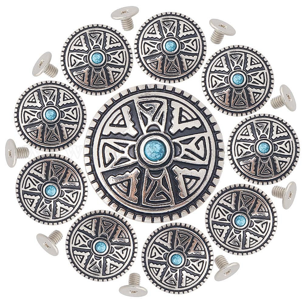 10 наборы декоративных заклепок из цинкового сплава, с синтетической бирюзой и железными винтами, для кошелька, , украшение кожаных ремесел, плоско-круглые
