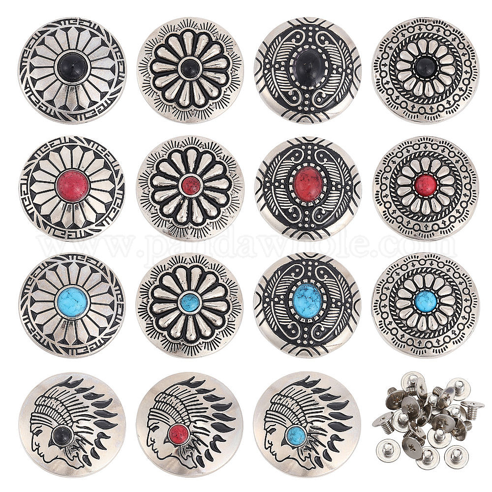 15 наборы 15 стили цветок/голова индейца сплав и имитация бирюзы ручная работа сплошная заклепка, с железным винтом, плоско-круглые, для поделок багажа и аппаратных принадлежностей