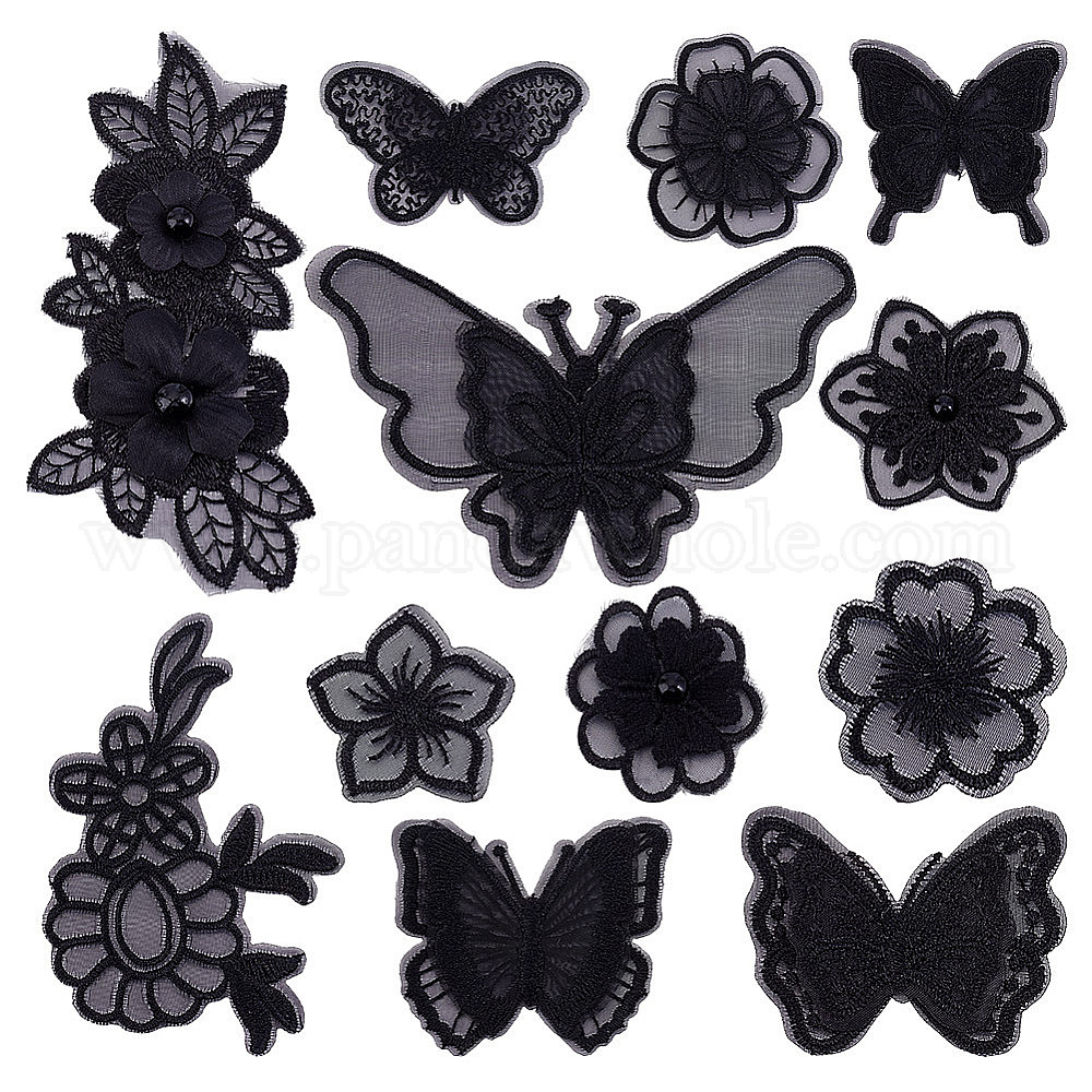 12 шт. 12 стили черная органза вышивка нитками приклеивание/пришивание заплаток, аппликации из ткани, бабочка, цветок