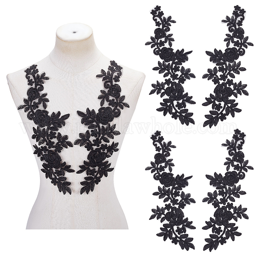 • Черный Нашивки из полиэфирного кружева с цветами, чёрные, 374x145x1 мм