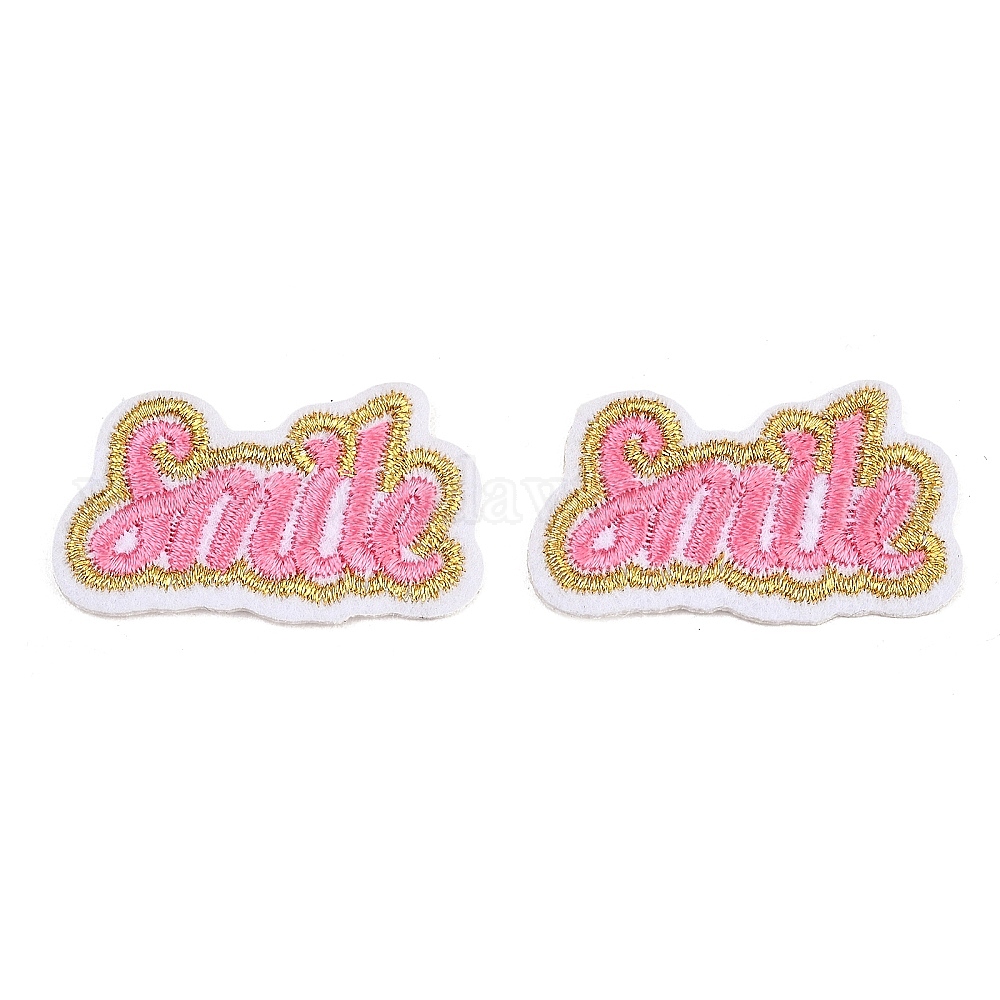 • Pink Полиэстер, компьютерная вышивка, нашивки, пришивные и приклеиваемые утюгом., слово улыбка, аппликации нашивки, розовые, 39x22.5x1.5 мм