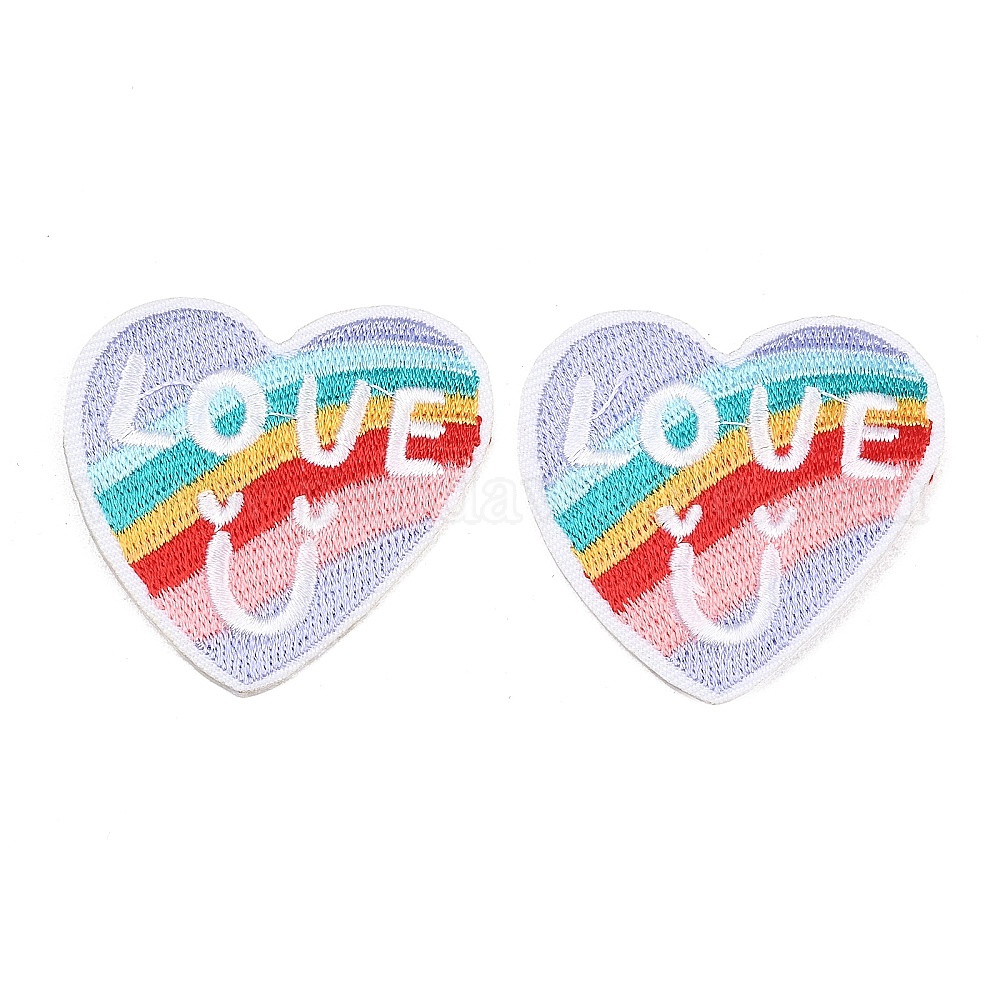 • Разноцветный Полиэстер, компьютерная вышивка, нашивки, пришивные и приклеиваемые утюгом., сердце со словом "love", аппликации нашивки, красочный, 45.5x46.5x2 мм