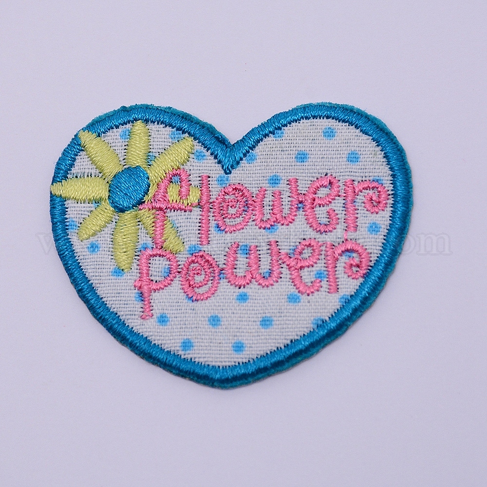 • Голубой Компьютеризированная вышивка тканью утюжок на / шить на заплатках, аксессуары для костюма, аппликация, сердце со словом цветочная сила, голубой, 36x45x2 мм