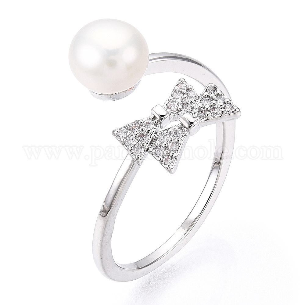 • Платинированный Открытая манжета на палец с натуральным жемчугом, прозрачное микропаве с фианитами, кольца латуни пальца, бантом, Реальная платина, размер США 7 (17.3 мм)