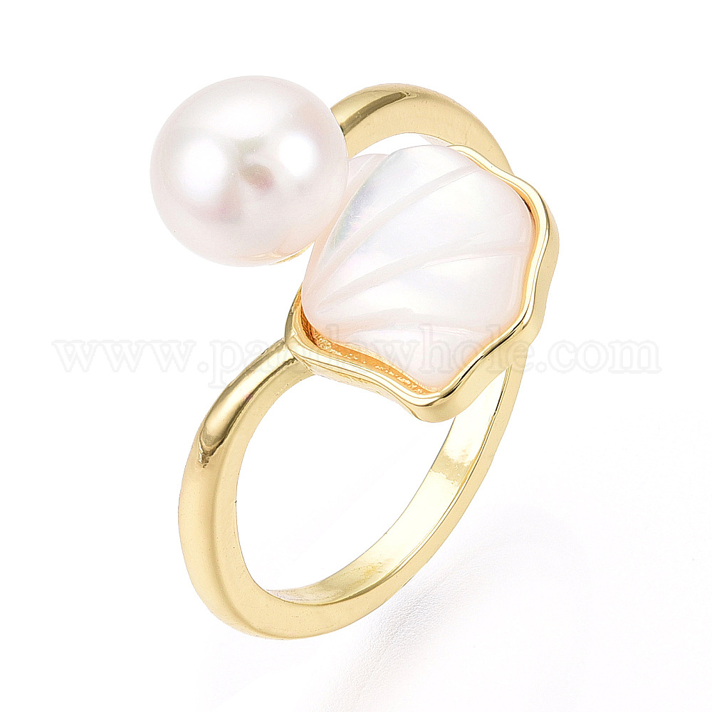 • Настоящее золото 18K Открытое кольцо-манжета с натуральным жемчугом и жемчужной устрицей с серебряными губами, кольца латуни пальца, формы раковины, реальный 18 k позолоченный, размер США 7 (17.3 мм)